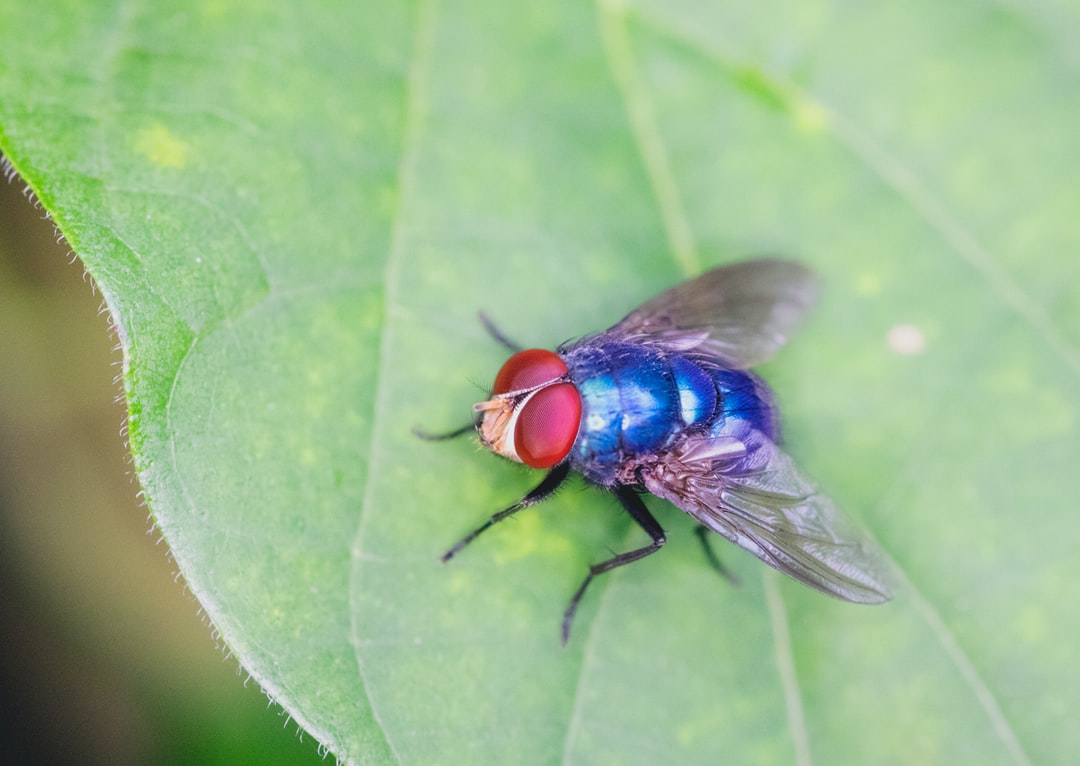 绿叶上的蓝和红苍蝇