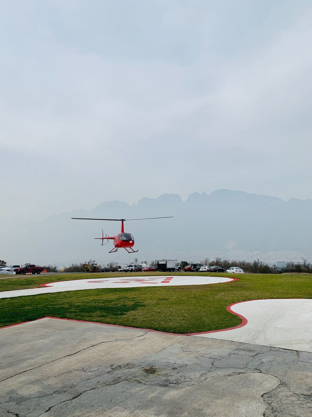 During the day, the red helicopter flying over the green grass