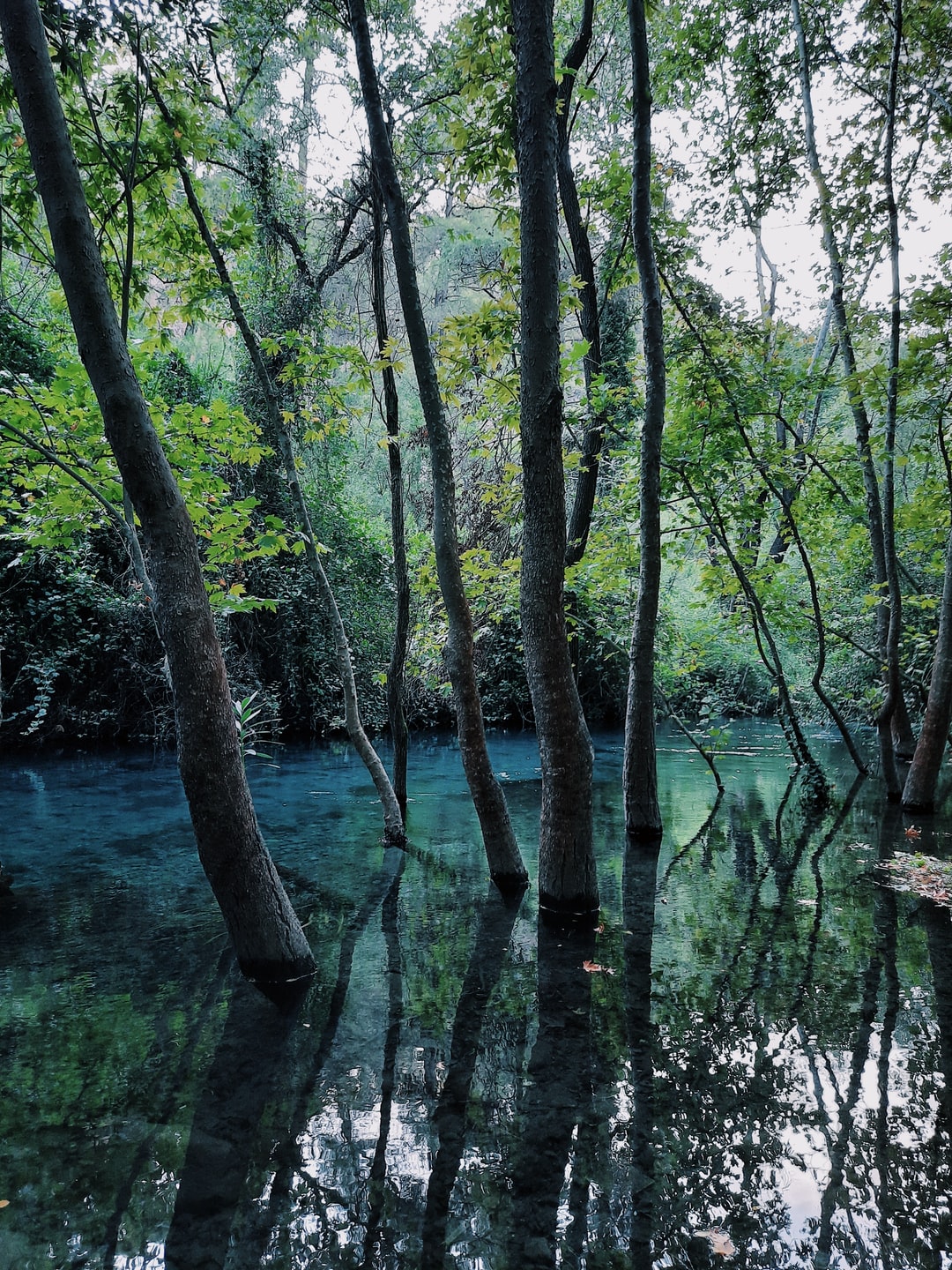 白天水面上的绿树