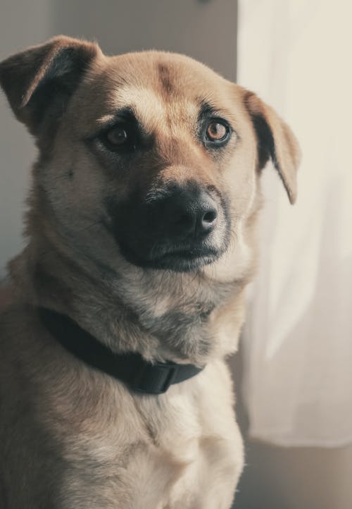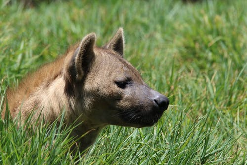 白天在绿色草地上踢足球的短毛棕褐色狗