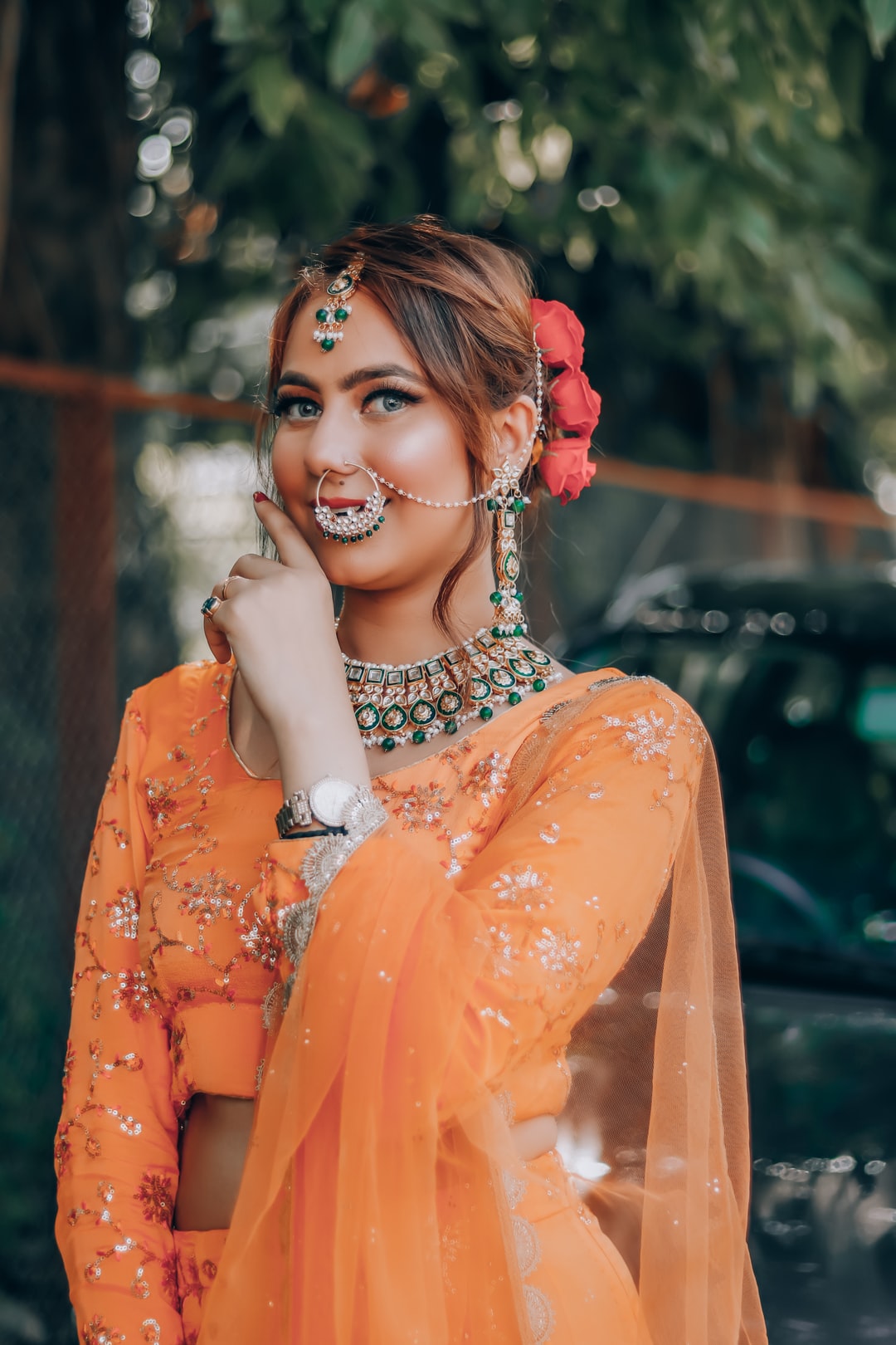 身穿橙色连衣裙、戴银项链的女子