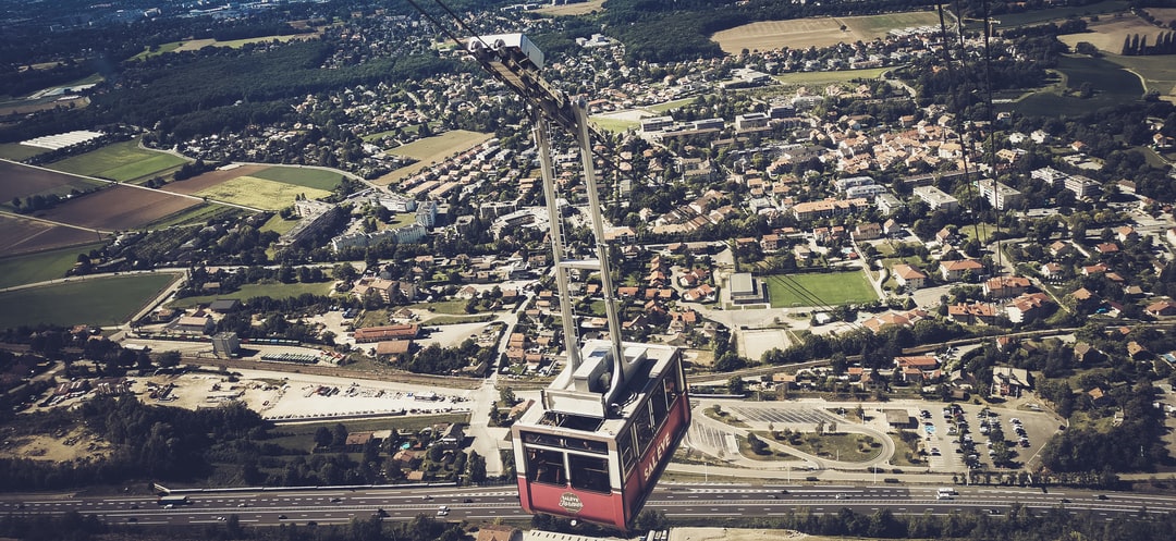 白天城市建筑物上方的红色和白色缆车