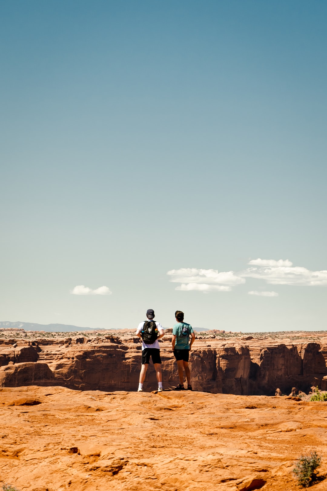 白天,身穿黑色t恤和黑色短裤的男子站在棕岩队形上