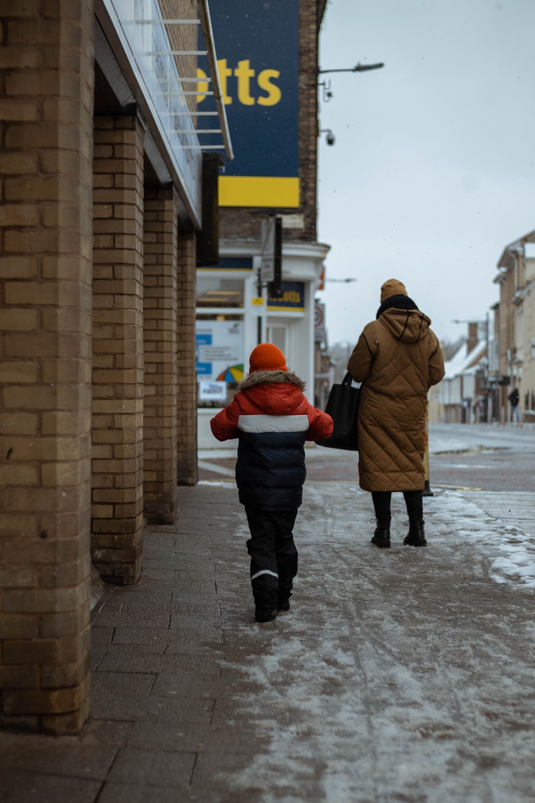 穿着棕色外套和黑色裤子的女人白天在积雪覆盖的路上行走