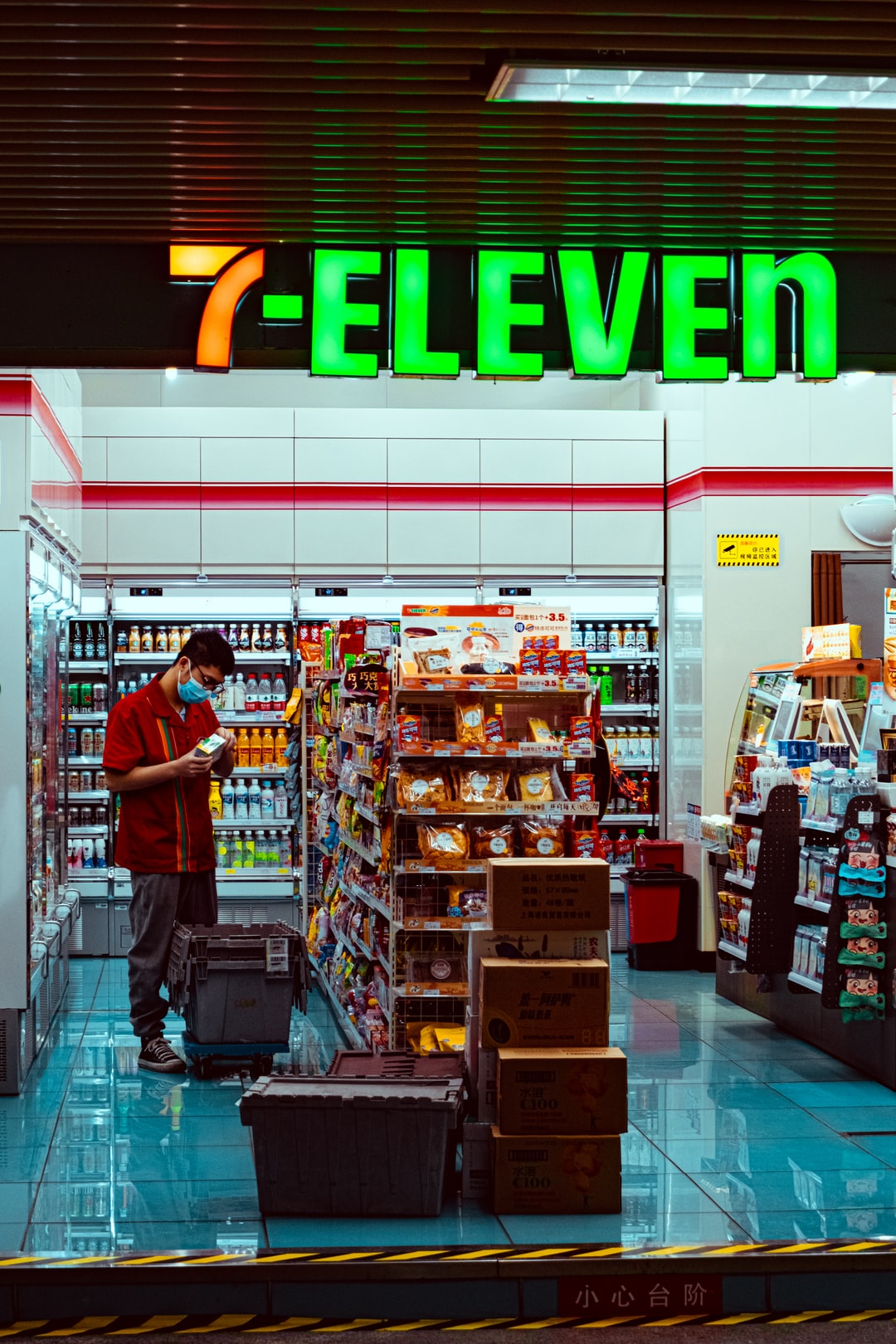 一个穿着红色t恤的男人站在食品摊前