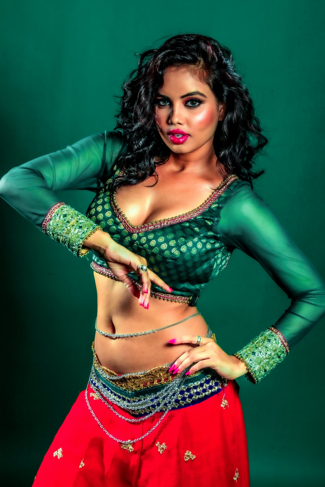 穿绿色和黑色长袖短上衣和蓝色和红色裙子的女士