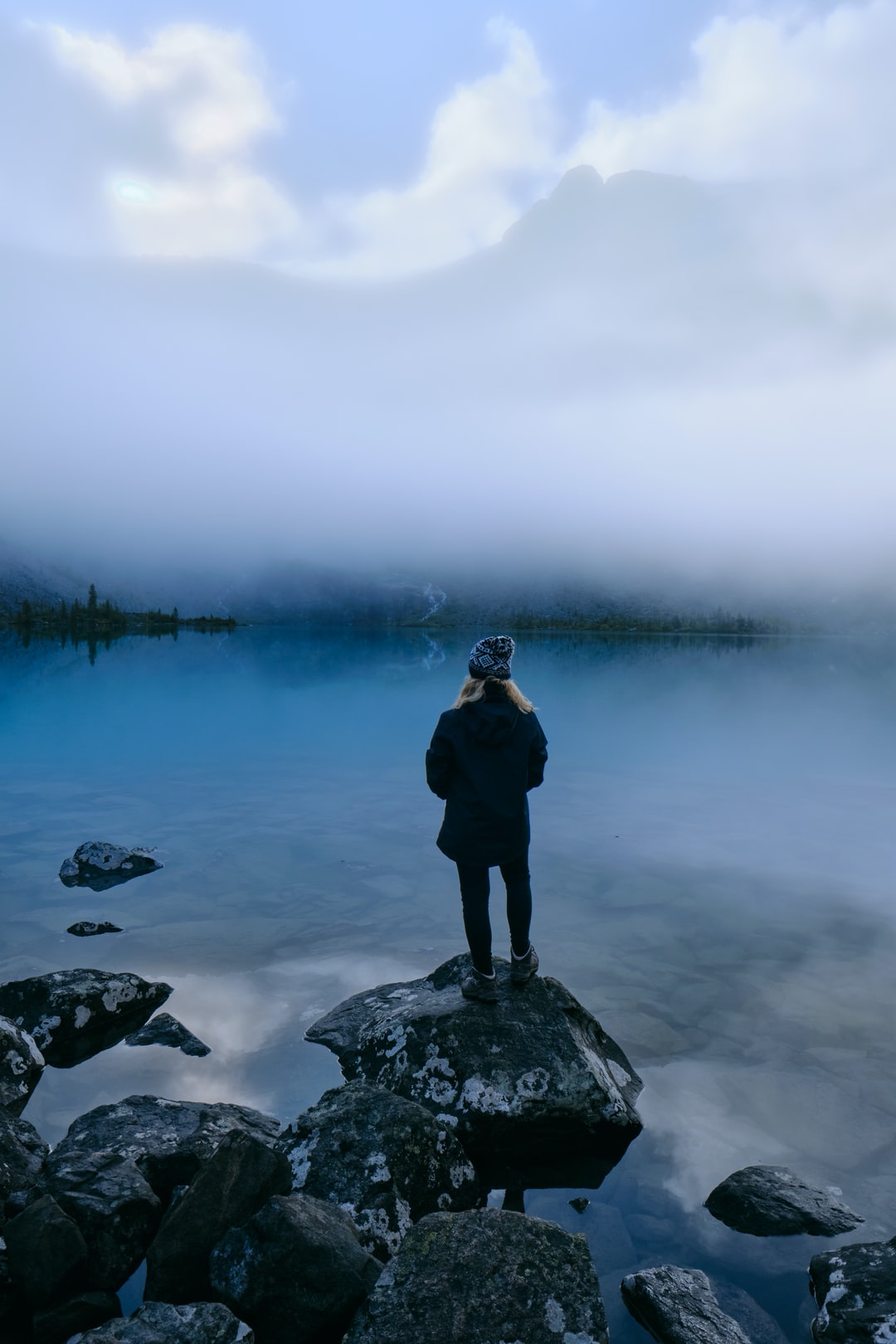 白天,身穿黑色夹克的男子站在水体附近的岩石上