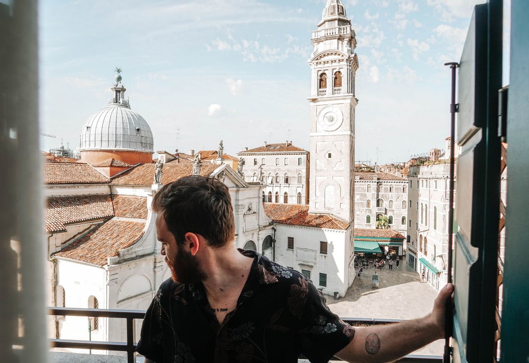 白天,一位身穿黑衬衫的妇女站在白色和棕色水泥建筑附近