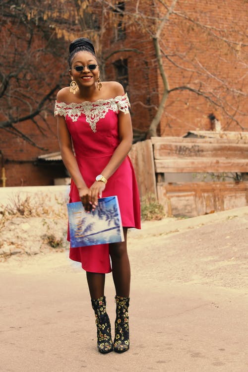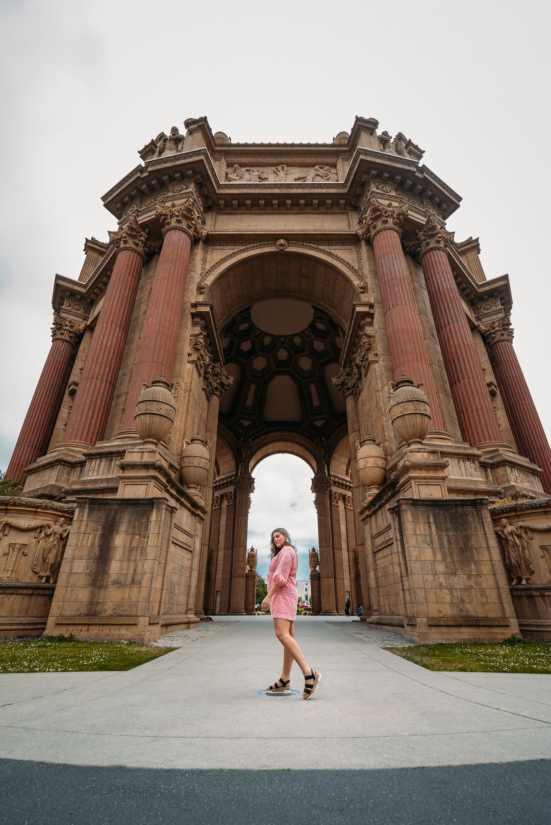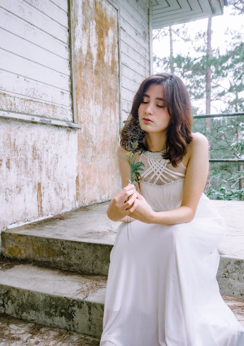白天,一个穿着白色衣服的女人站在棕色水泥大楼附近