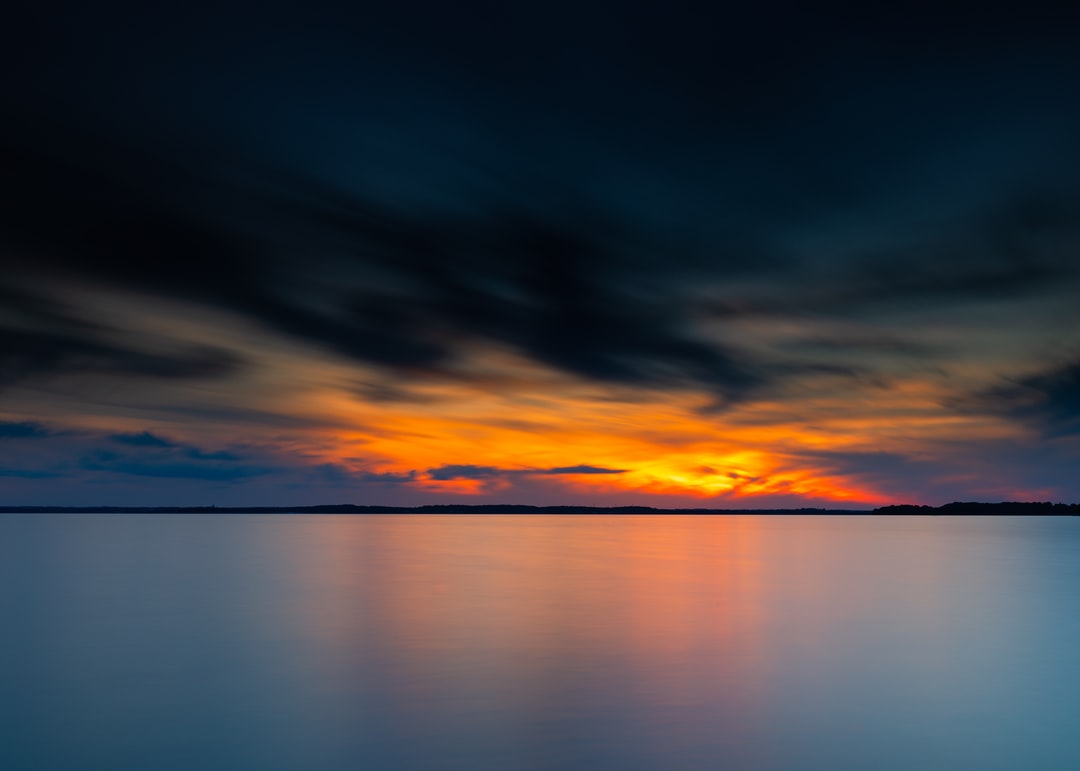 日落时多云天空下的水体