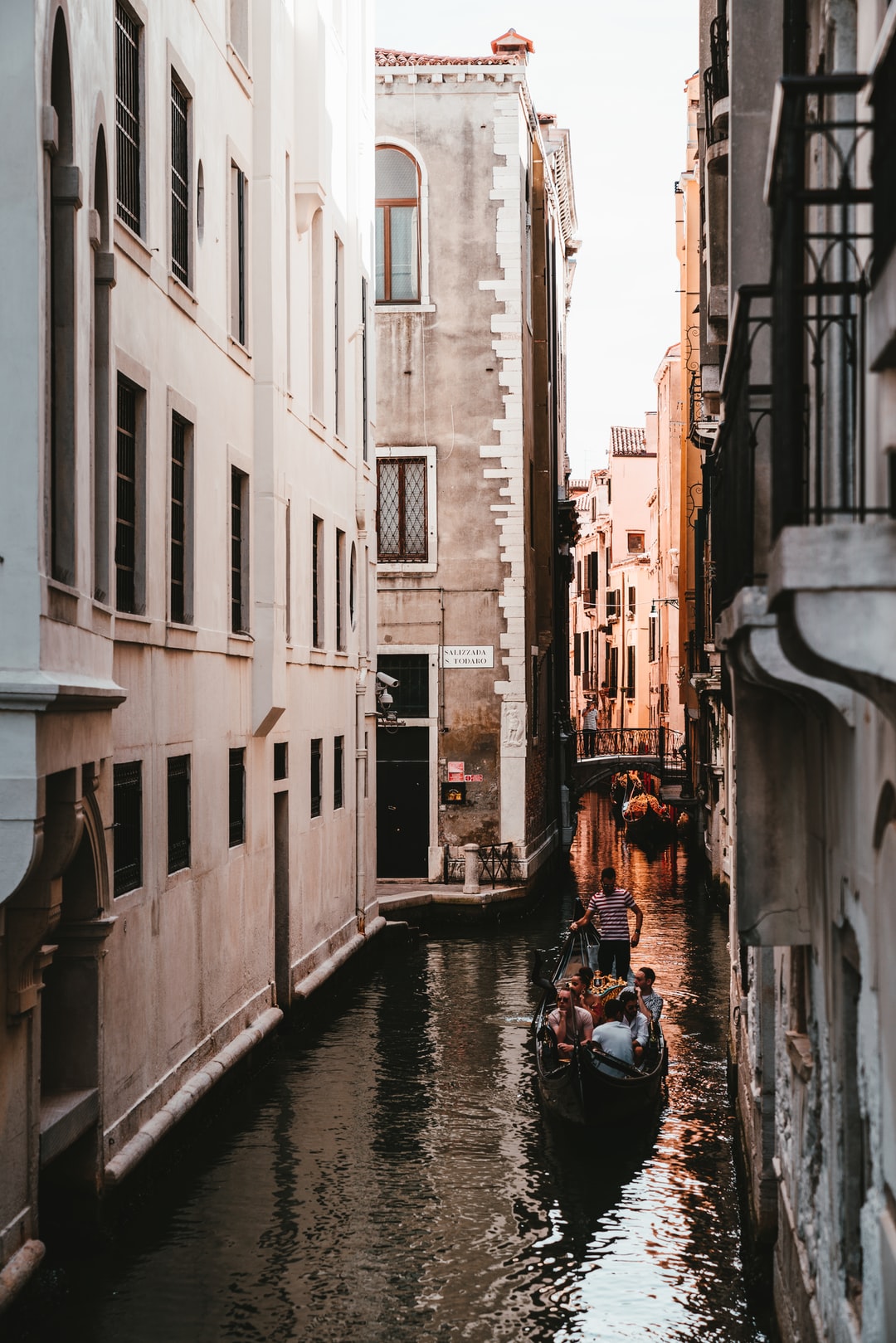 白天,人们在水泥建筑物之间的河上乘船