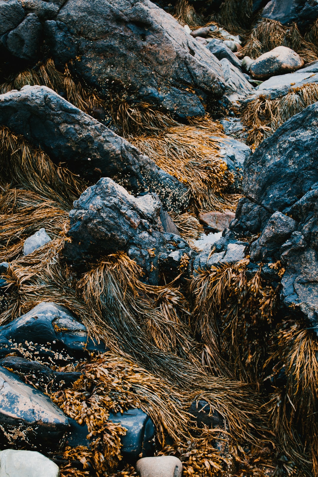 褐色草地上的黑色岩石