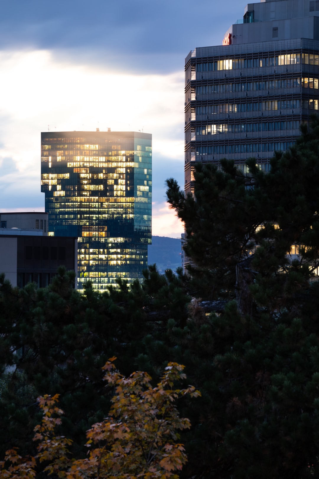白天高层建筑附近的绿树