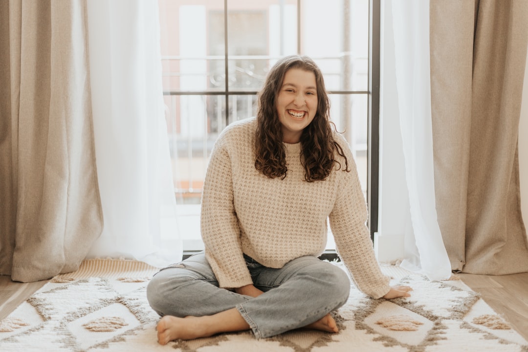 女人穿着白色的毛衣和蓝色牛仔裤坐在白色和棕色的花床