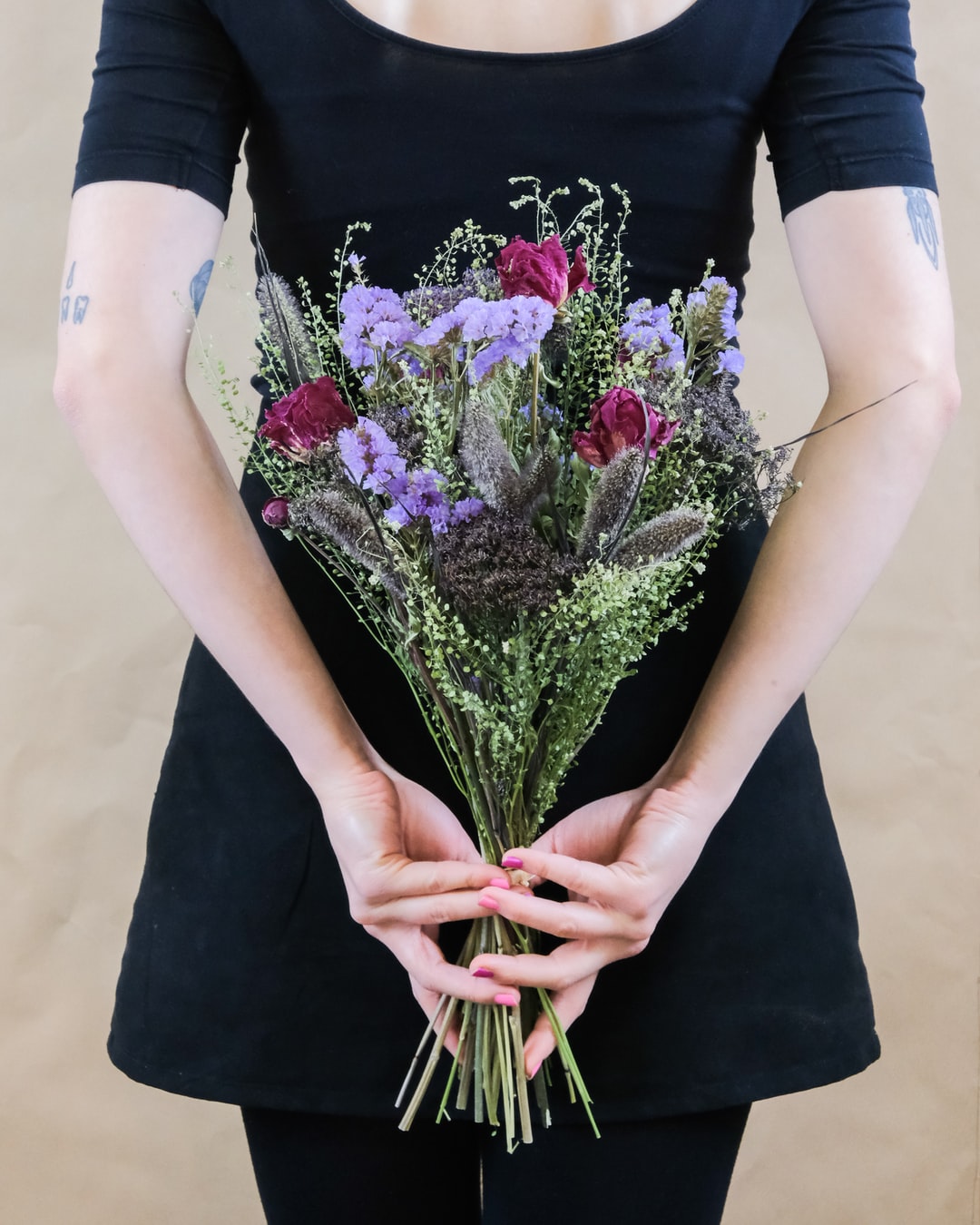 女人在黑色连衣裙束鲜花