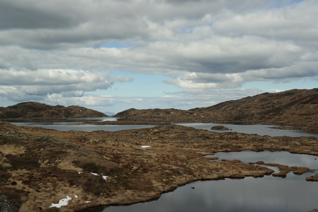棕色和绿色山脉旁边的水域在白云和蓝天白天