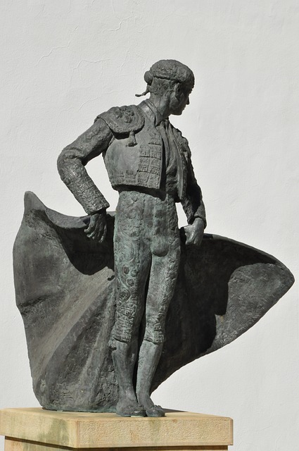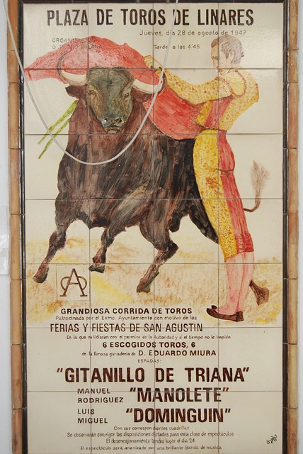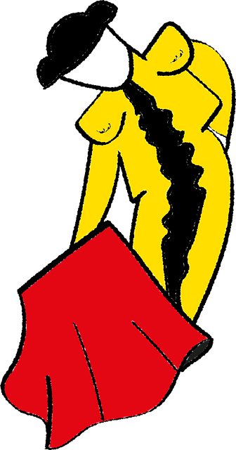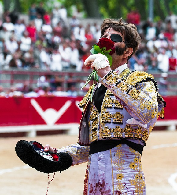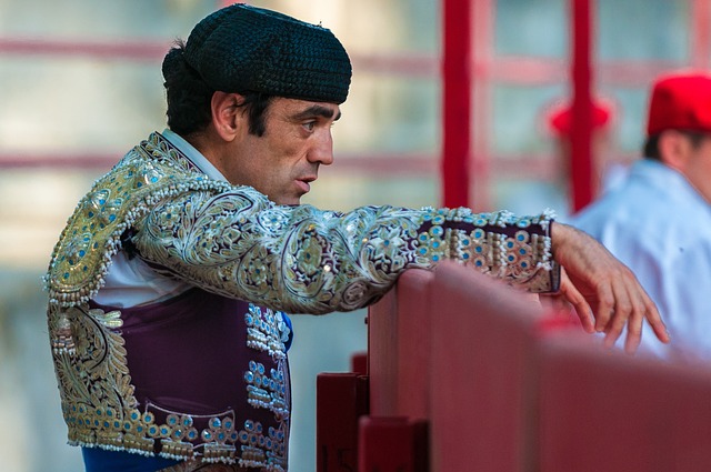 黑牛前手持红色纺织品的男子