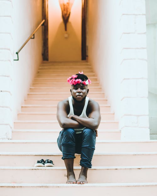 坐在混凝土楼梯上拿着苏打水瓶的男子