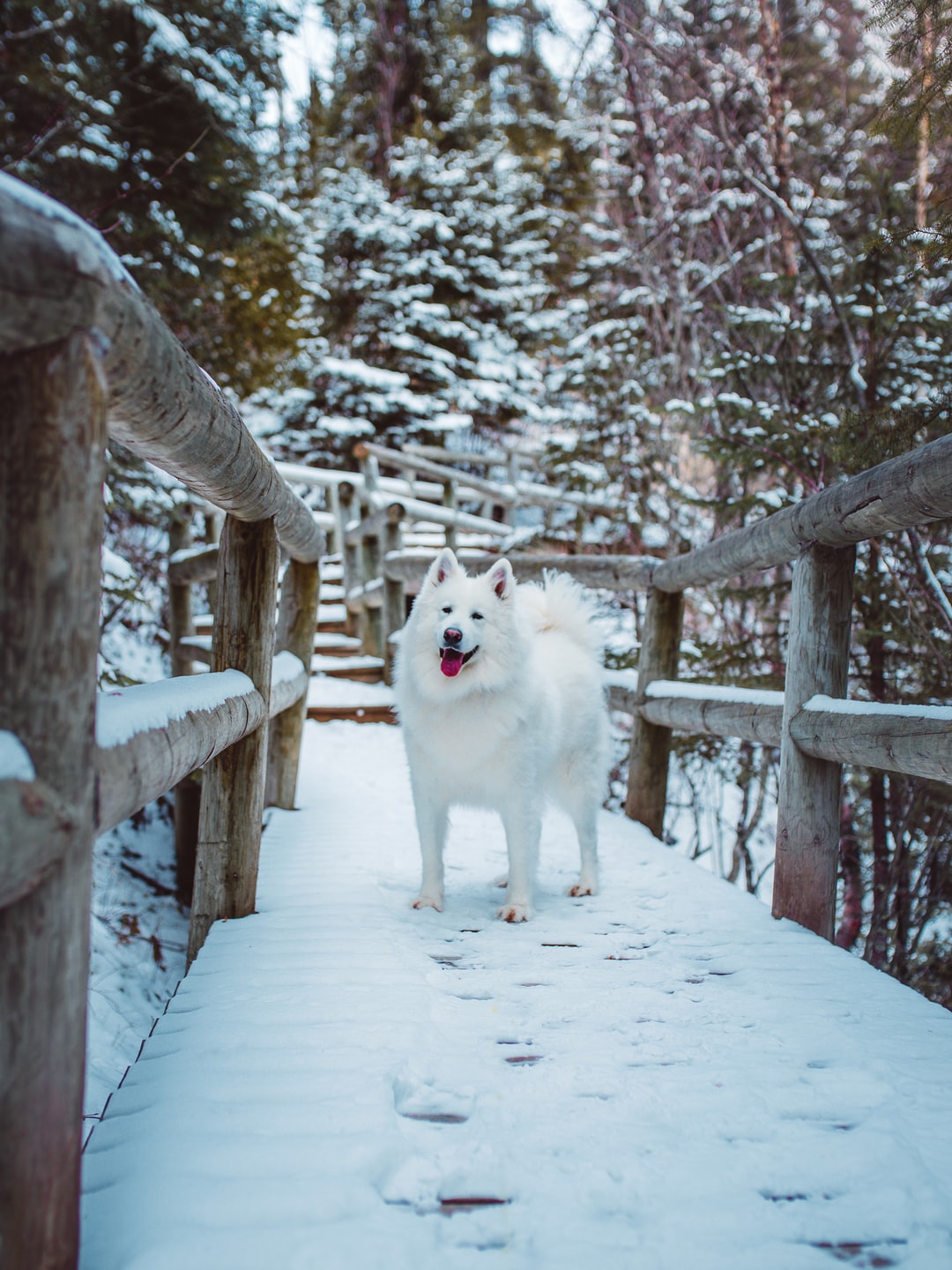 白天站在棕色木桥上的成年白色萨摩耶人