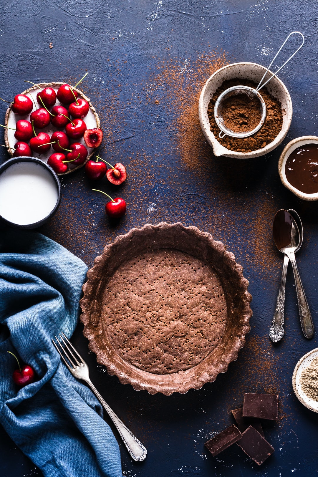 馅饼盘、樱桃和粉末的平放照片