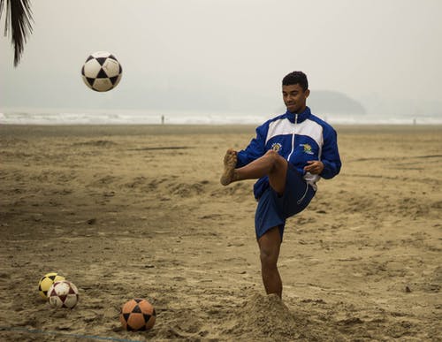 男人穿蓝色短裤玩白天的沙滩上的白色和红色的足球