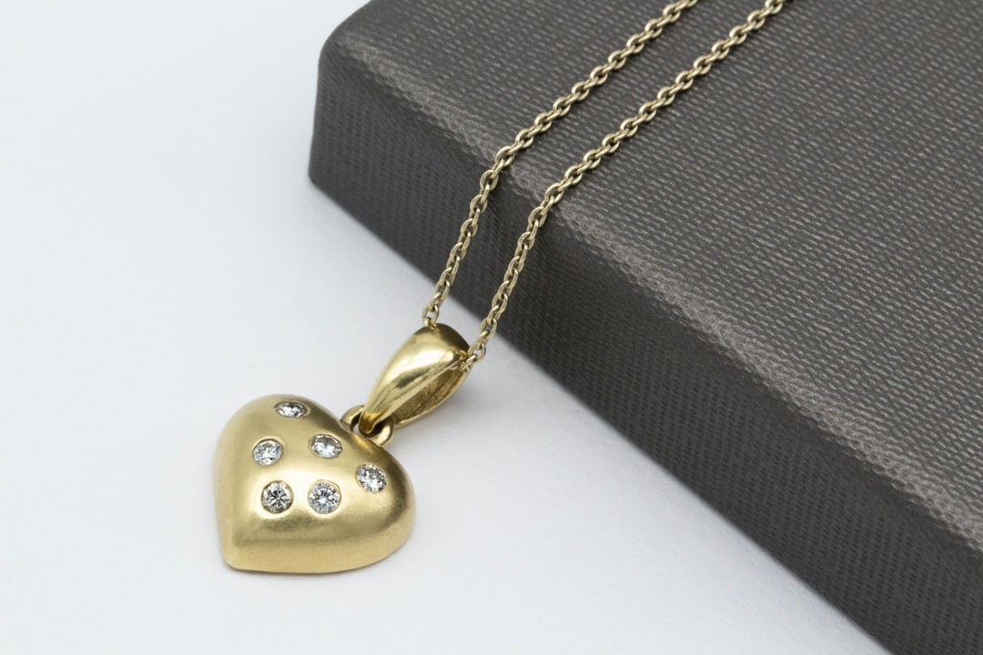 灰色皮袋旁的金色心形吊坠项链
