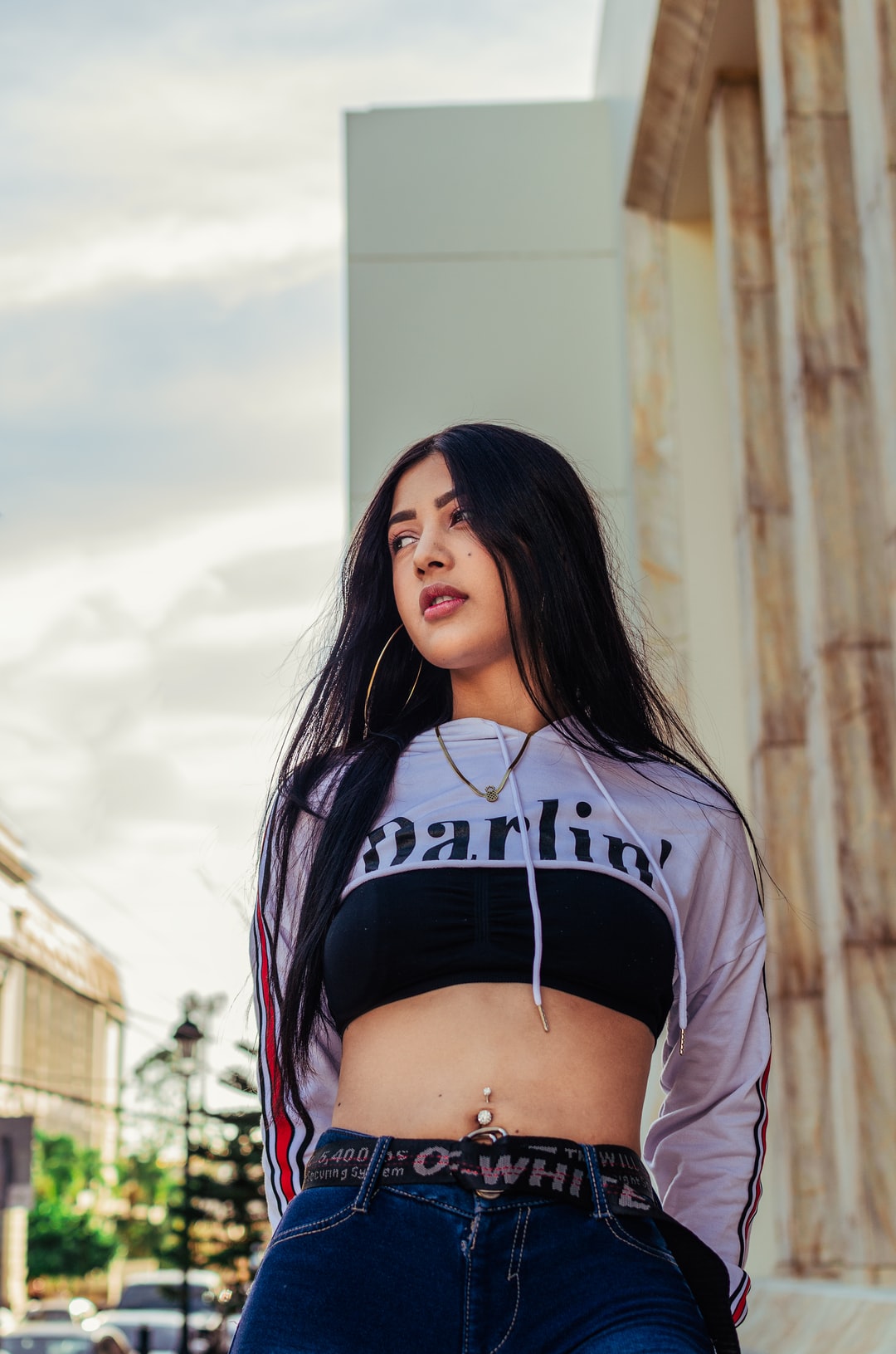 一名妇女站在大楼附近,同时瞥了一眼她的右侧