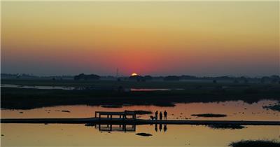 在日落日出之下,在桥上骑车经过的人
