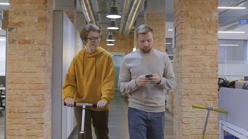 一个男人和一个女人一起走在办公楼内使用手推车的女人 · 免费素材视频
