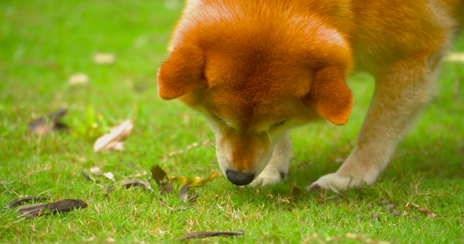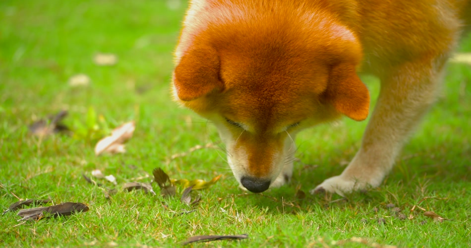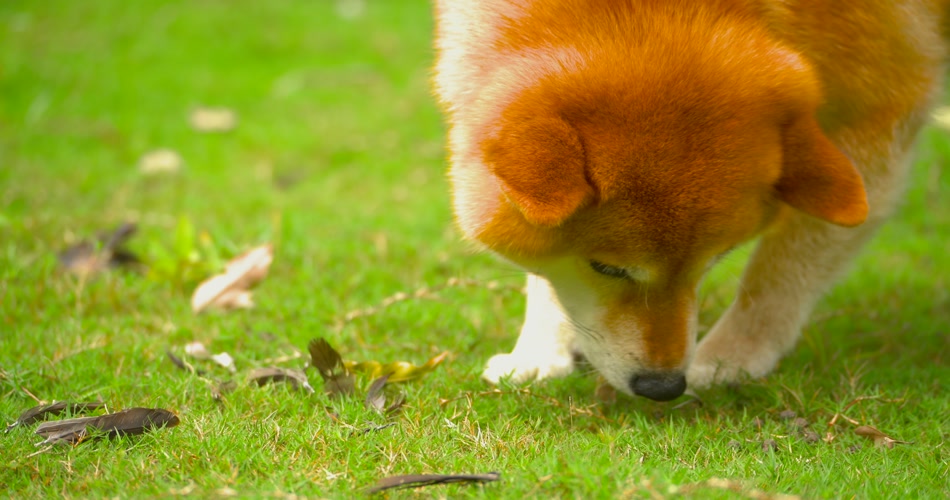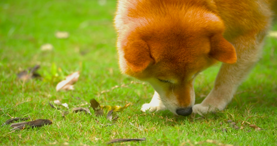 日可爱的本柴犬狗狗在公园草地上觅食