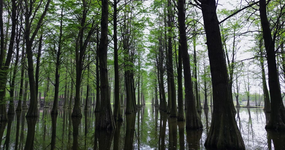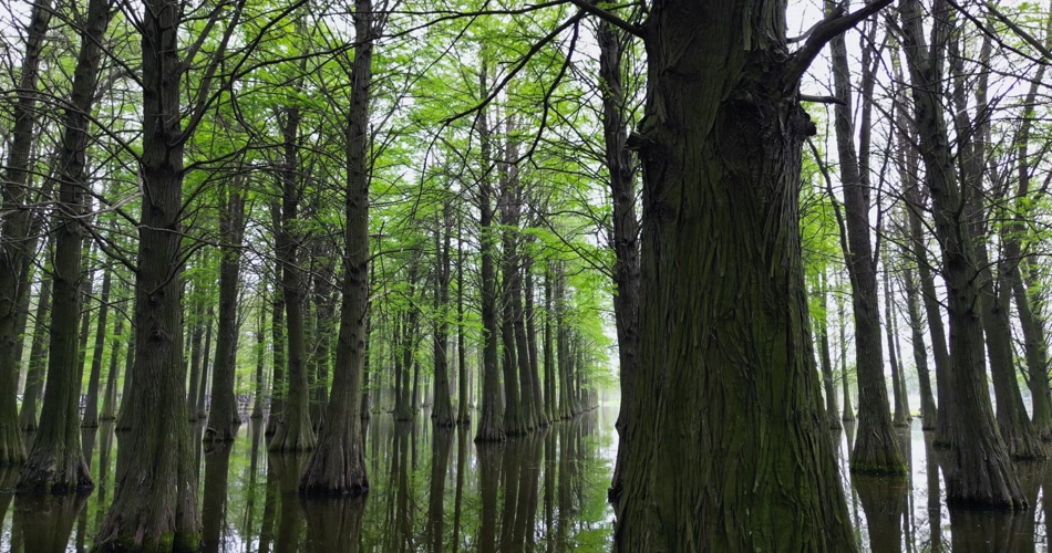 航拍水杉树林中穿梭如梦境