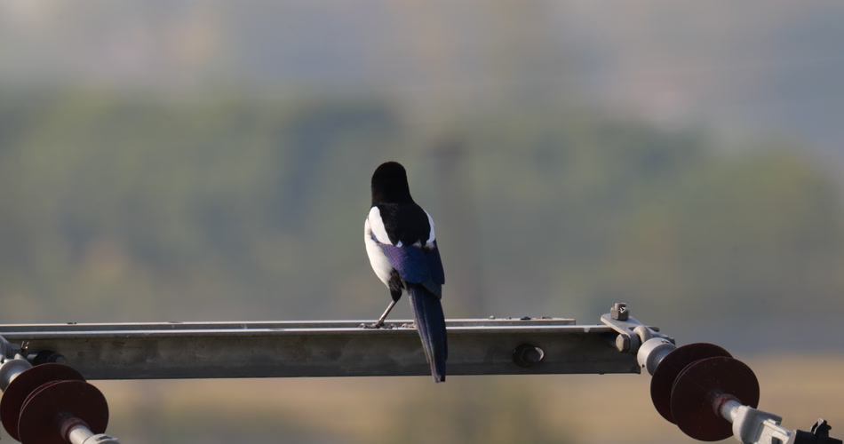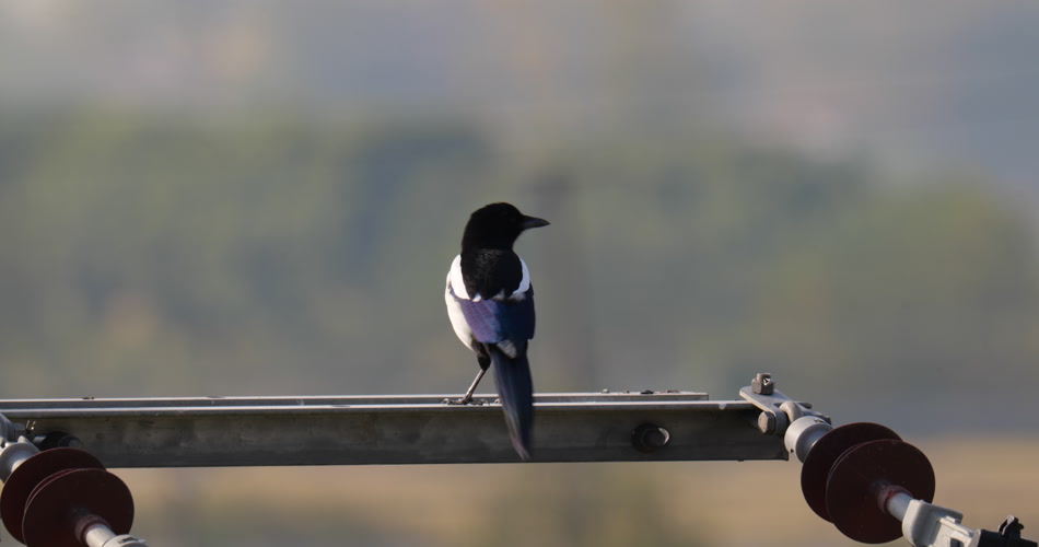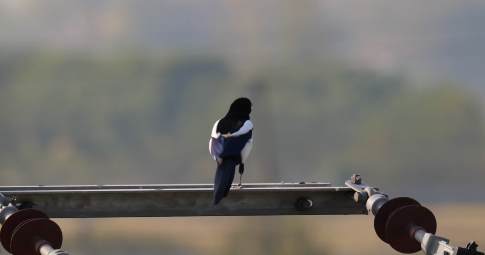 清晨电线杆上的喜鹊实拍