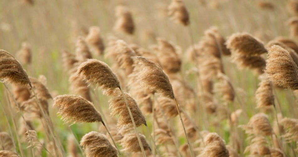 河边芦苇菖蒲香蒲荻芒随风摇曳