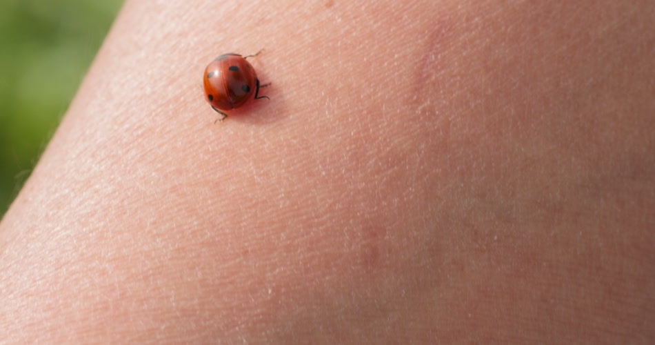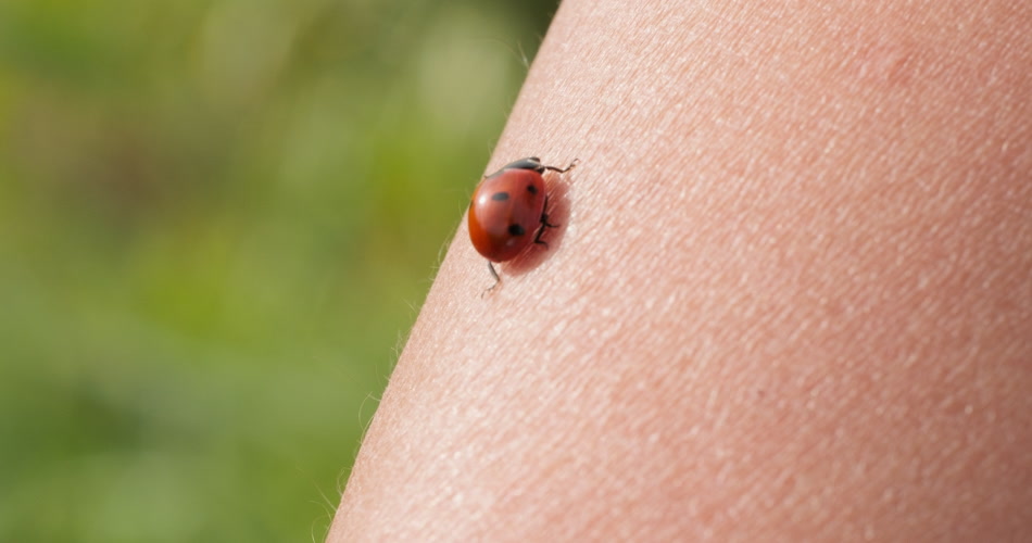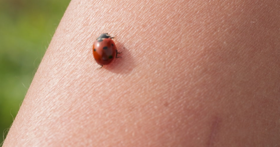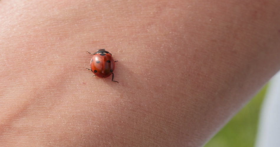 春天七星瓢虫在人类胳膊上爬行昆虫