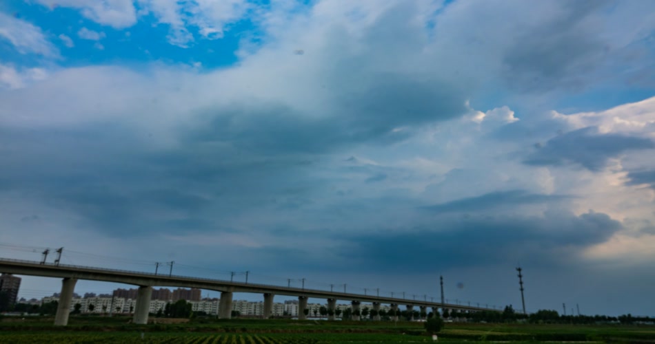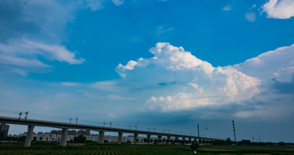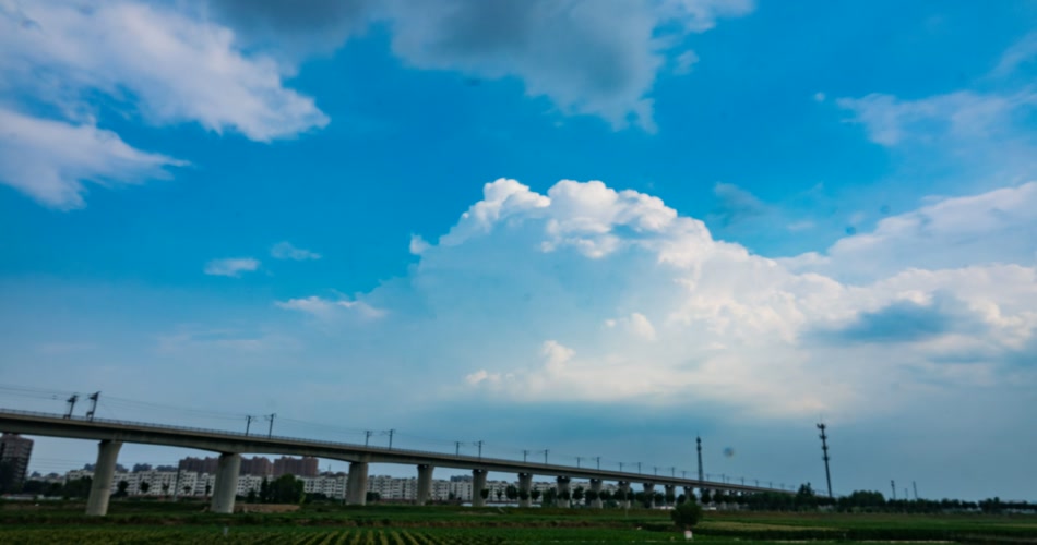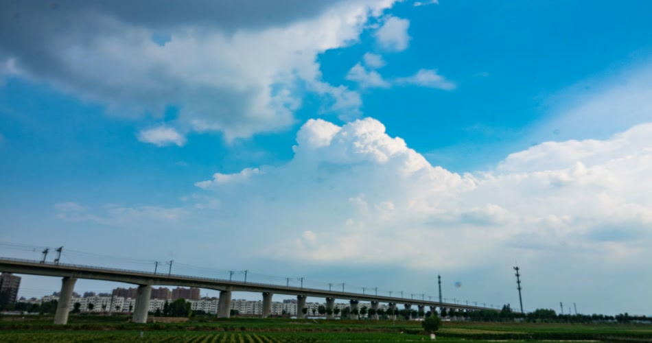 高铁桥延时摄影蓝天白云白云飘荡瞬间开始下雨镜头上落雨点高清