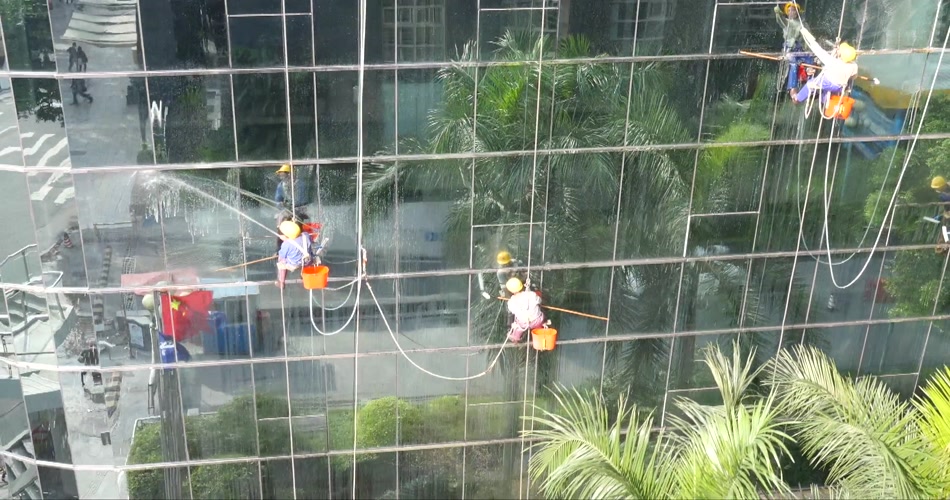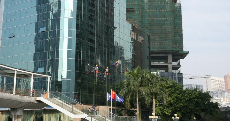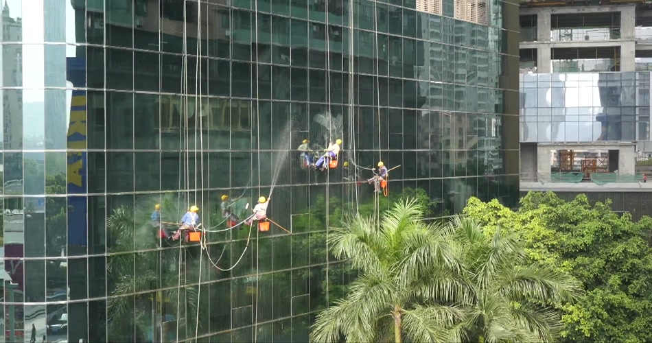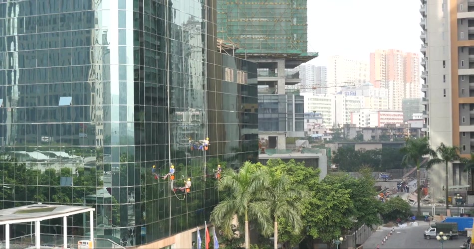 航拍高楼擦玻璃高空作业现代城市视频素材