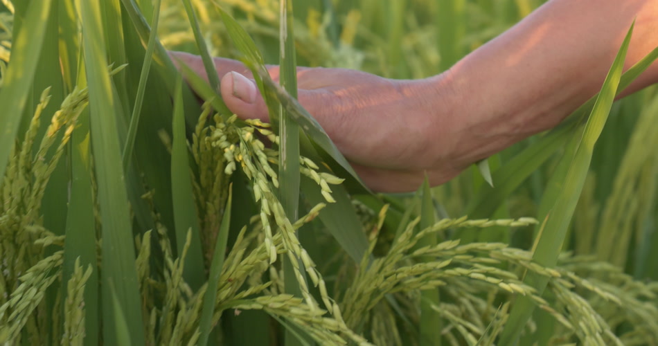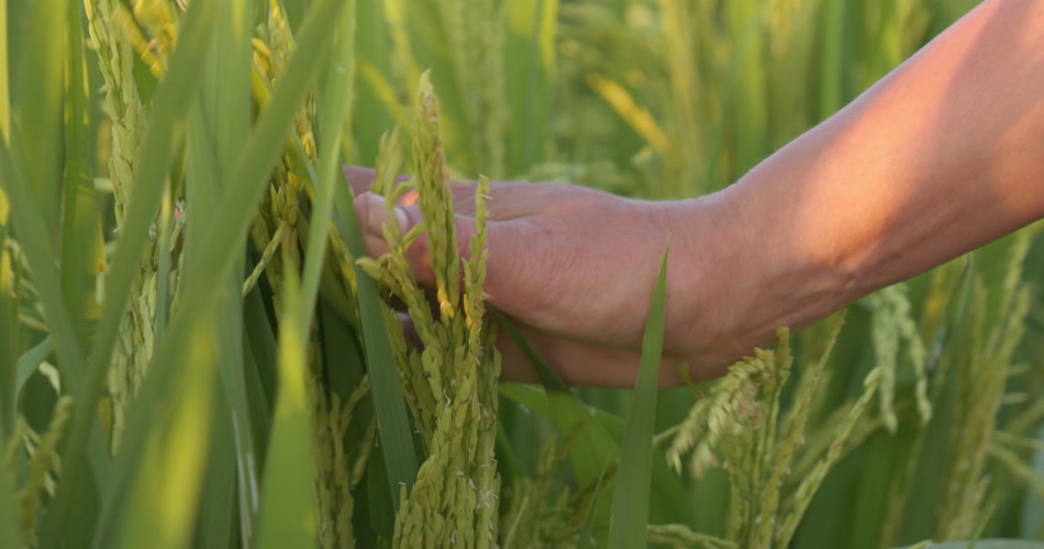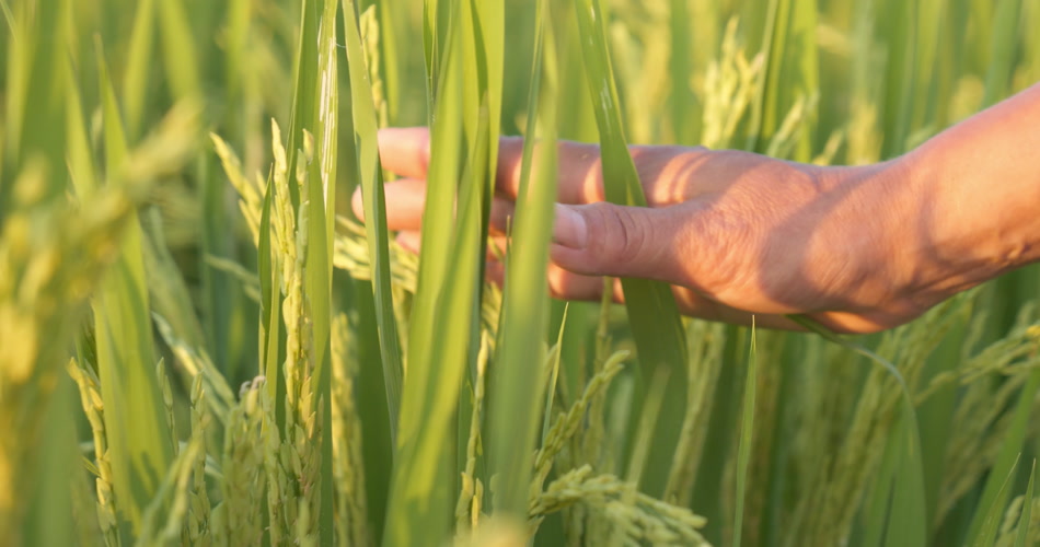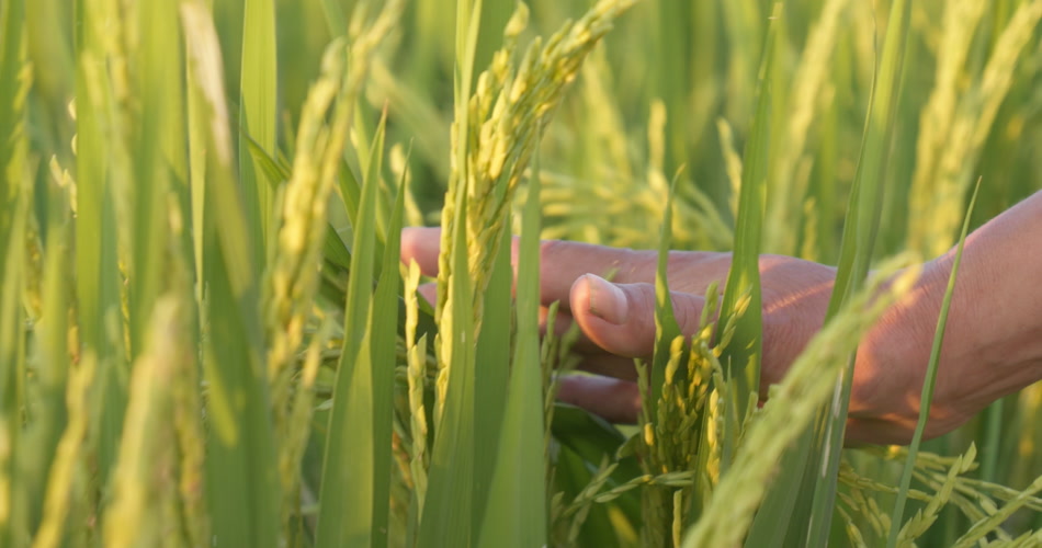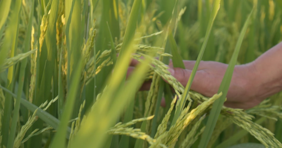 农民的手抚摸扫过水稻穗丰收