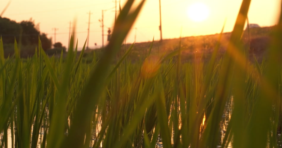 农村夕阳晚霞下的水稻田秧苗