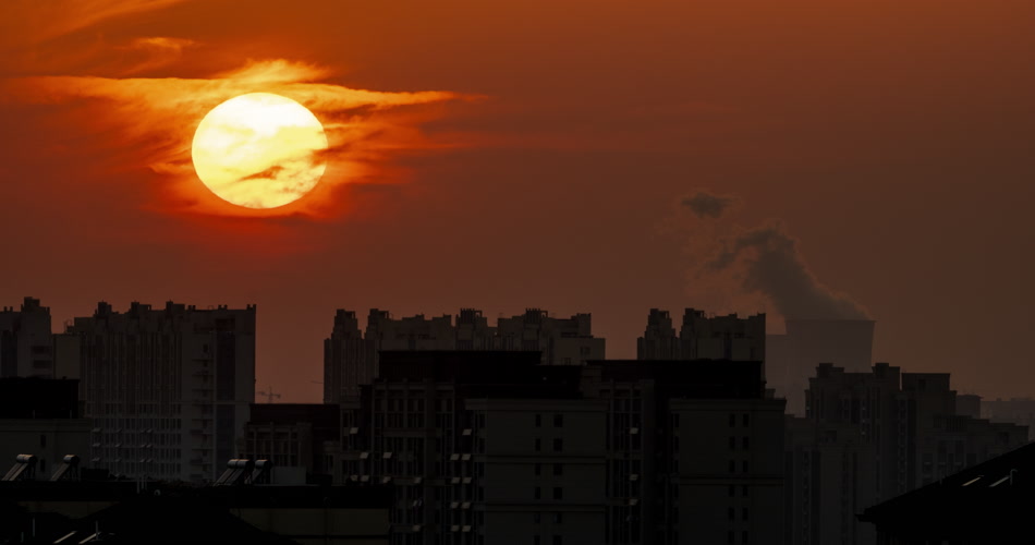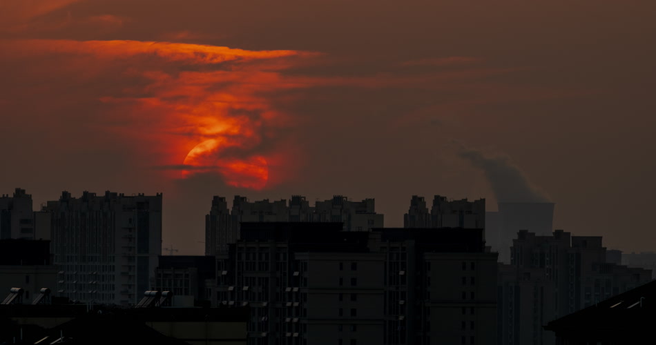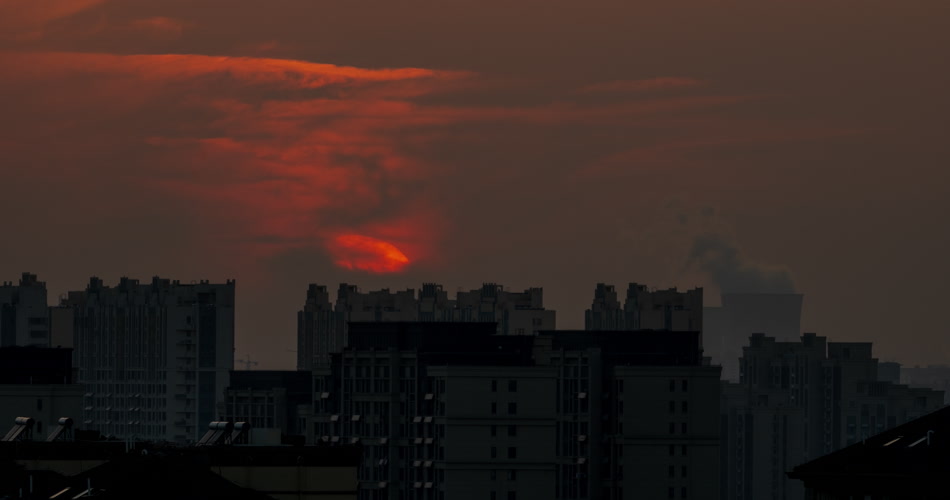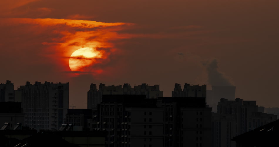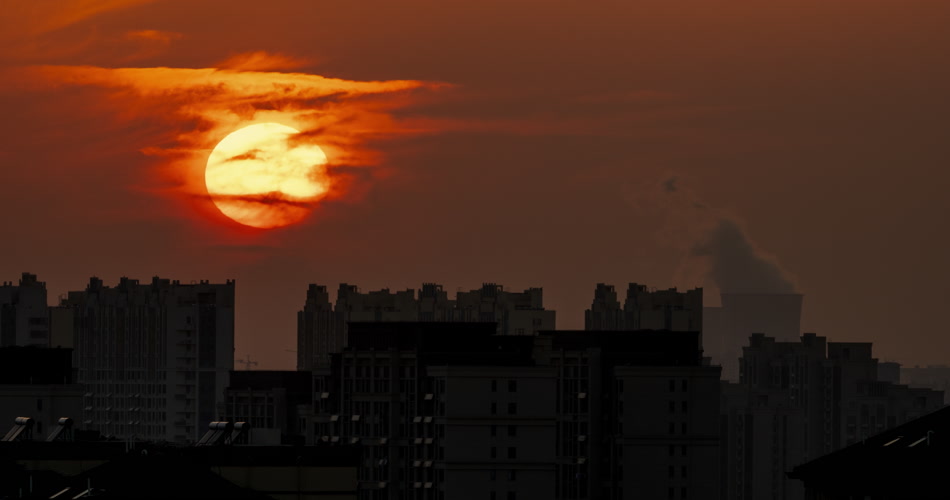 城市日落夕阳化工厂烟囱剪影