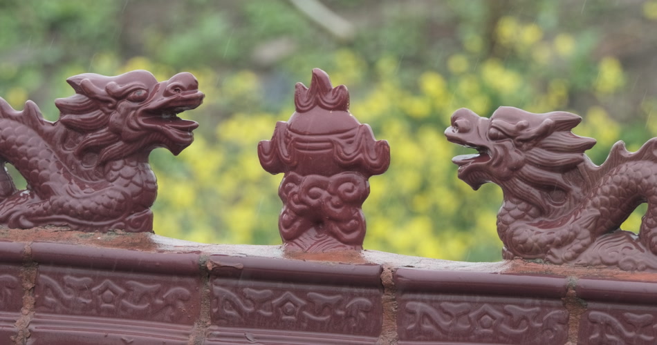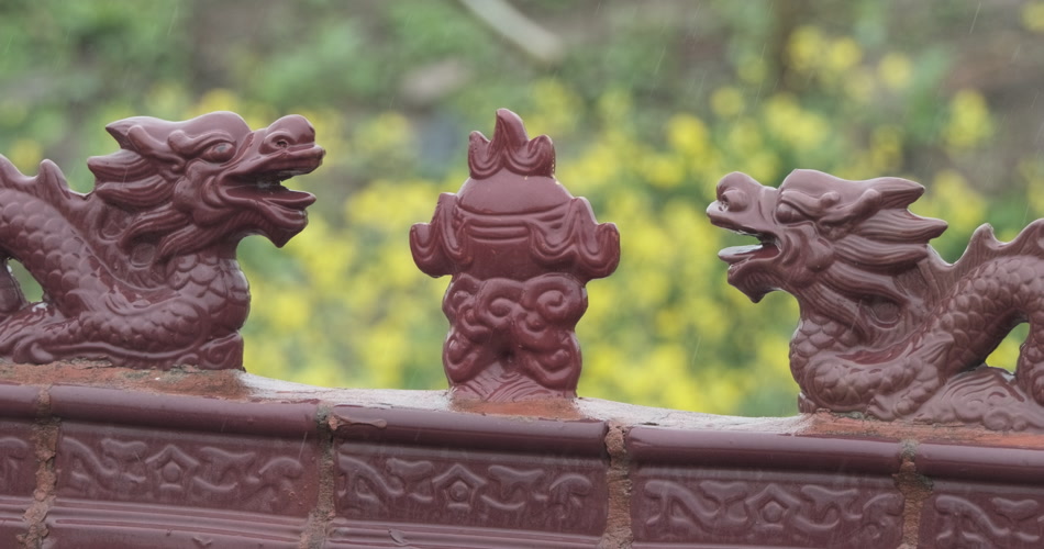 下雨倾盆大雨屋顶瓦片双龙戏珠