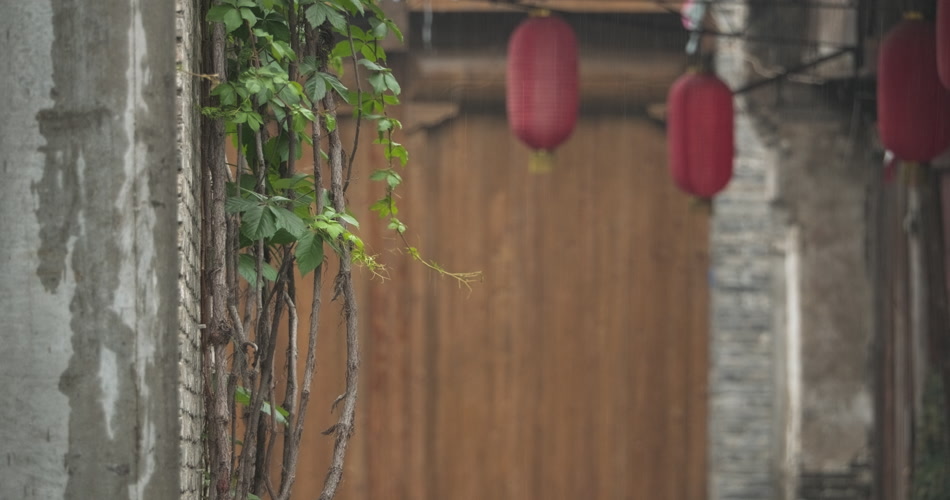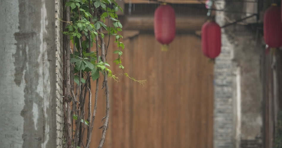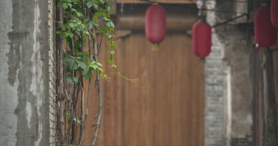 古镇小巷弄堂下雨灯笼爬山虎