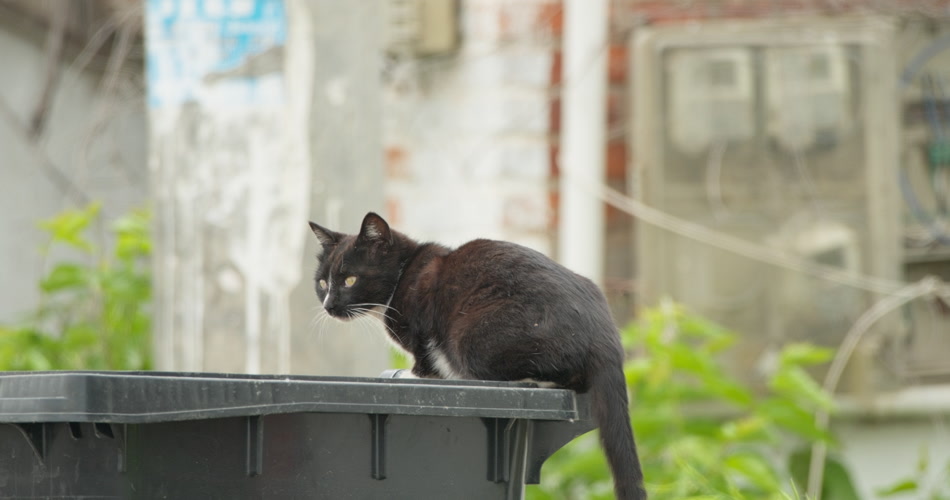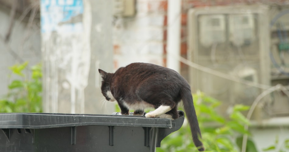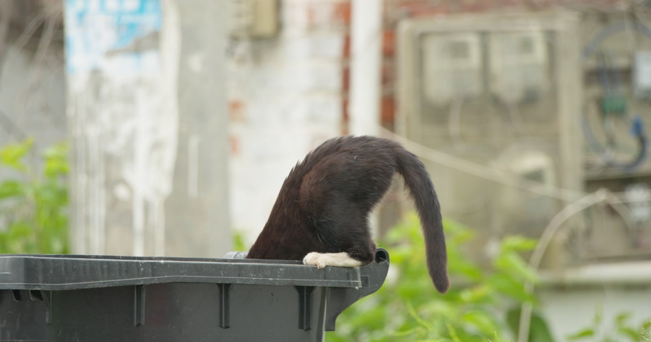 一只流浪猫在垃圾桶里觅食