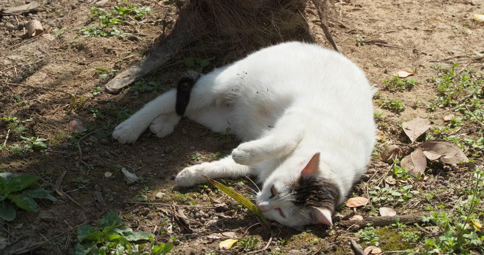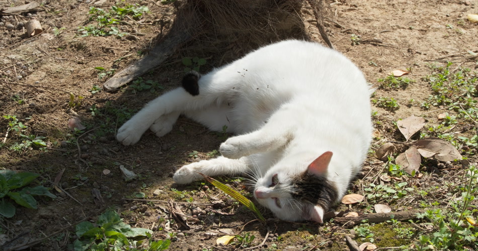 春天怀孕的流浪母猫地上打滚