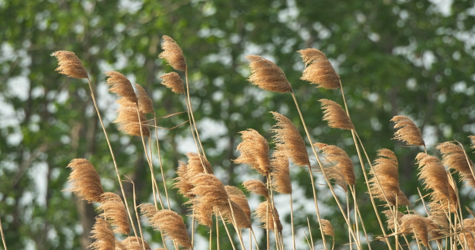 秋天河边枯黄芦苇随风摇摆