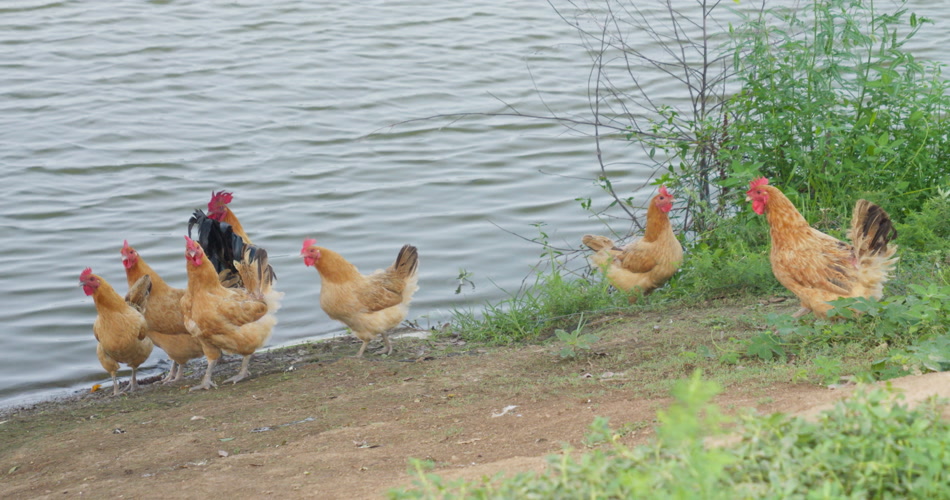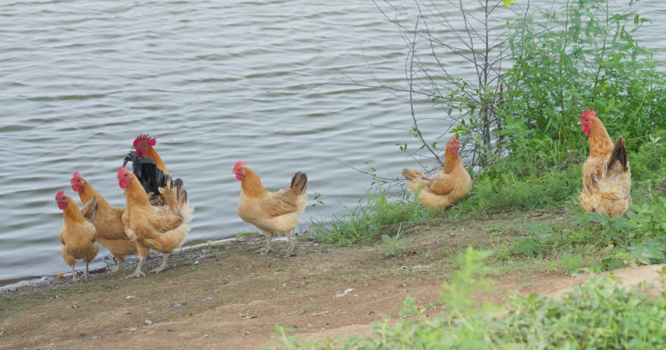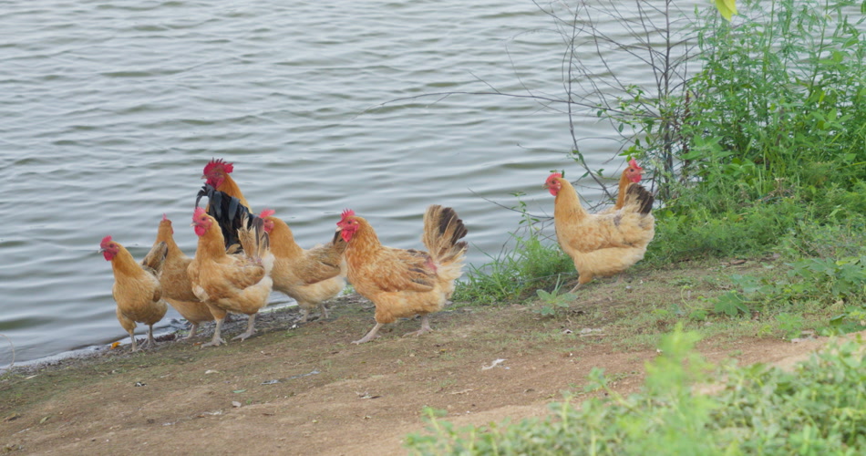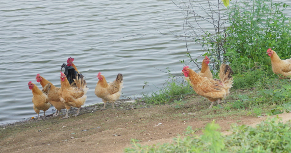 农村池塘河畔散养土鸡柴鸡