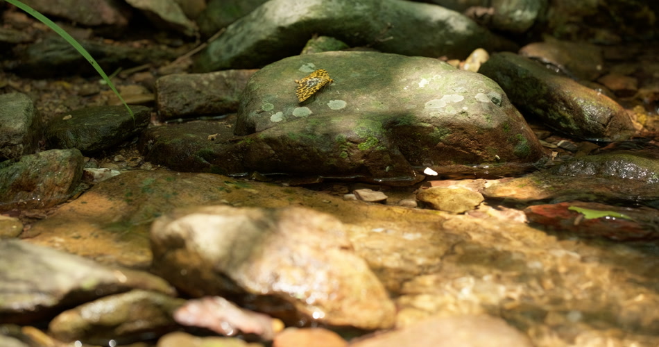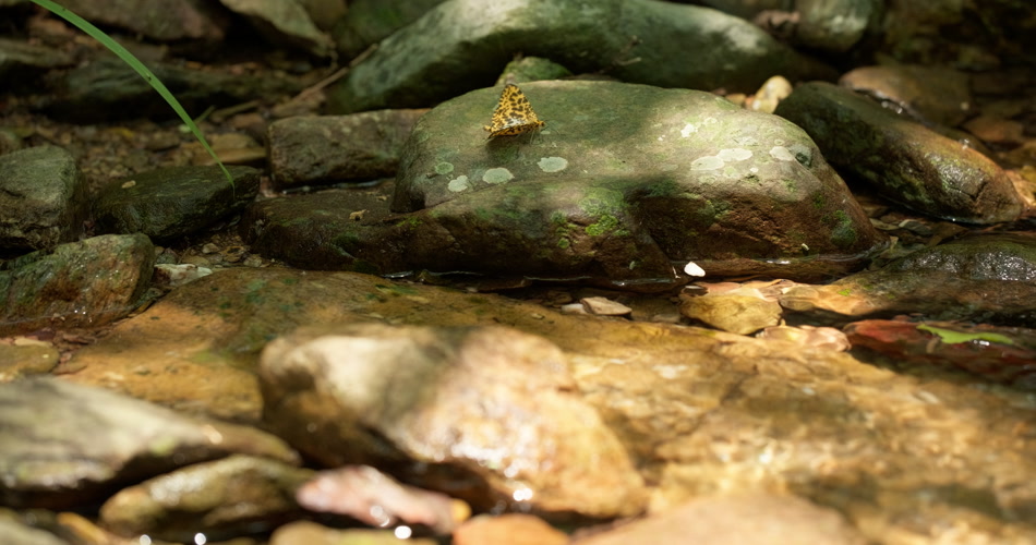 春天清澈山泉水小溪黄色蝴蝶
