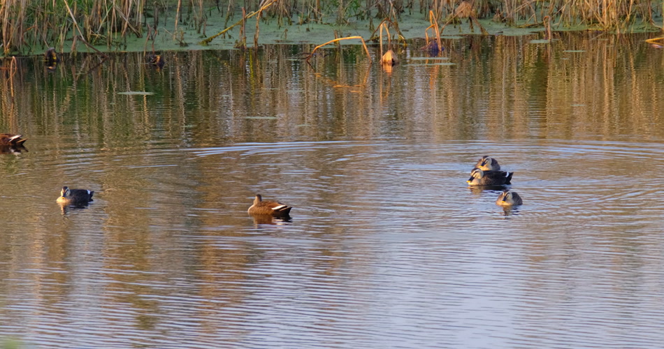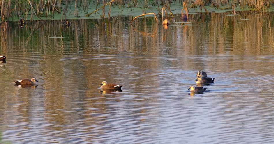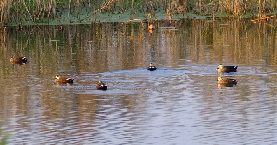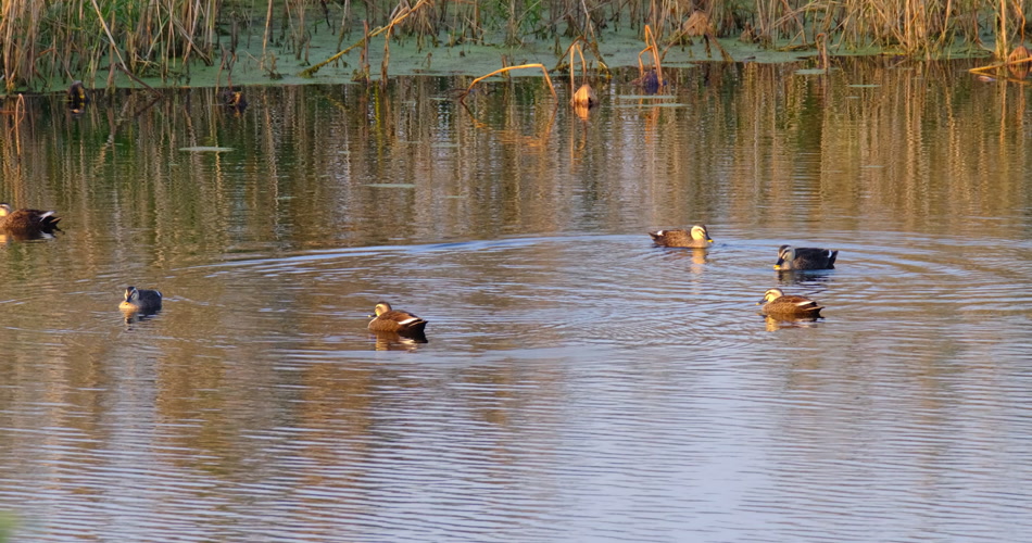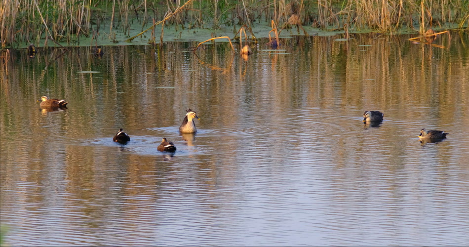 秋天湿地沼泽池塘野生斑嘴鸭子