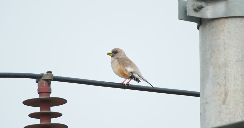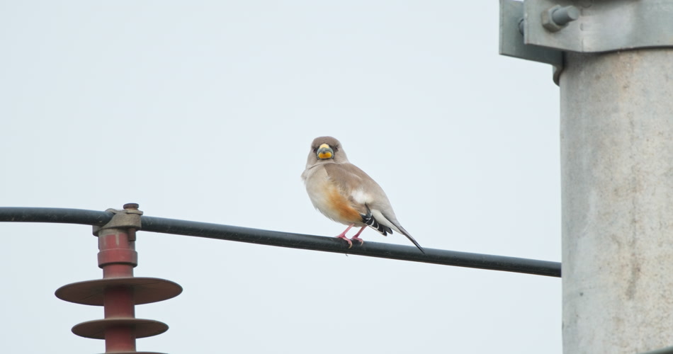 高压电线杆上小鸟黑尾蜡嘴雀