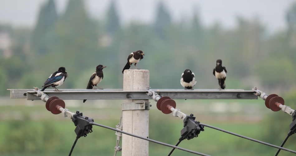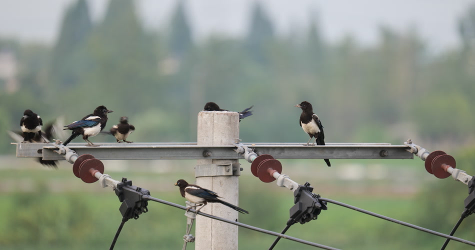 春天农村高压电线杆几只喜鹊