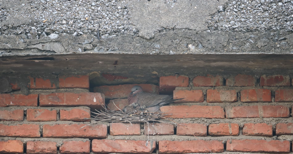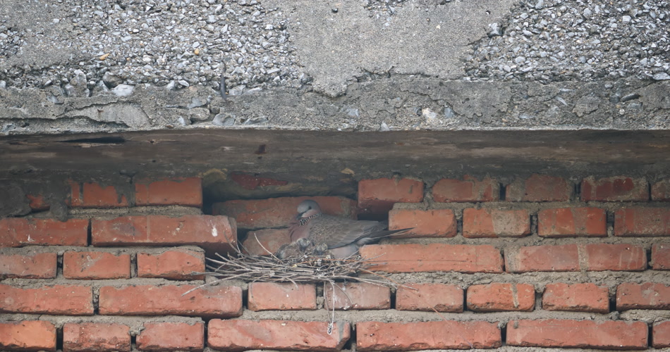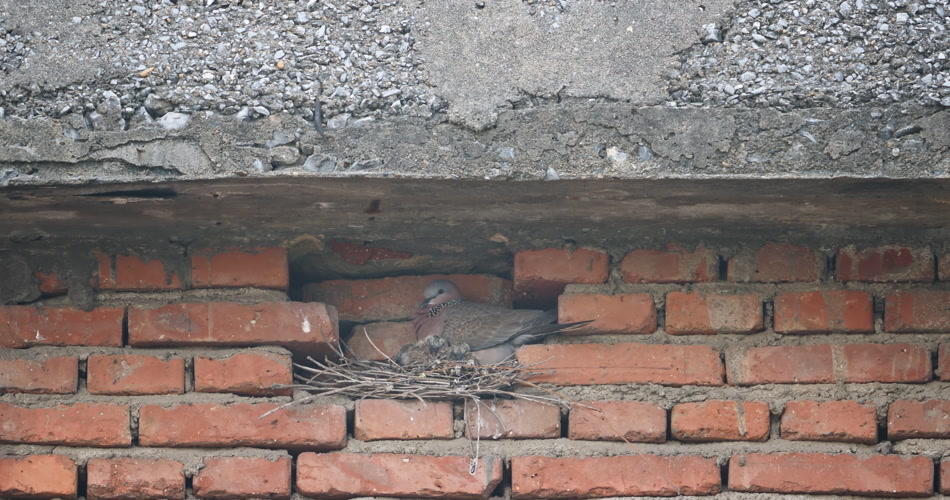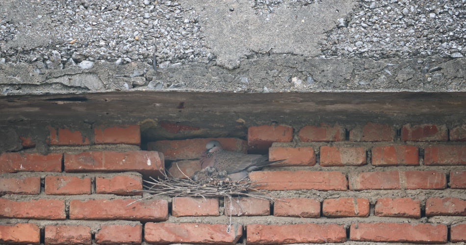 冬天屋檐下筑巢斑鸠雌鸟雏鸟